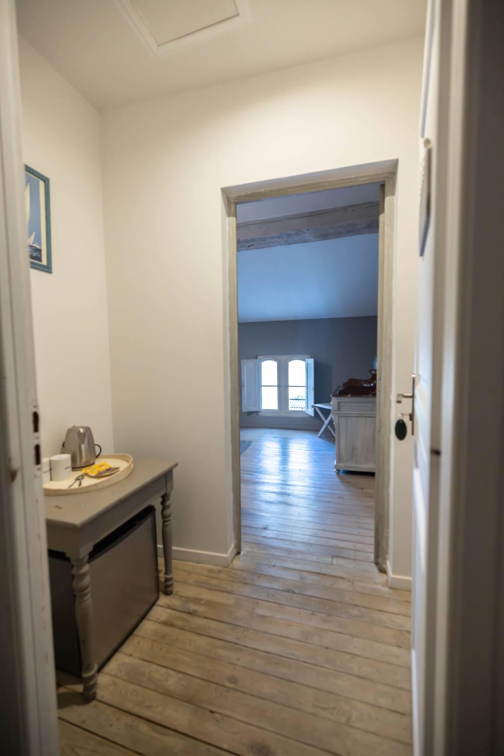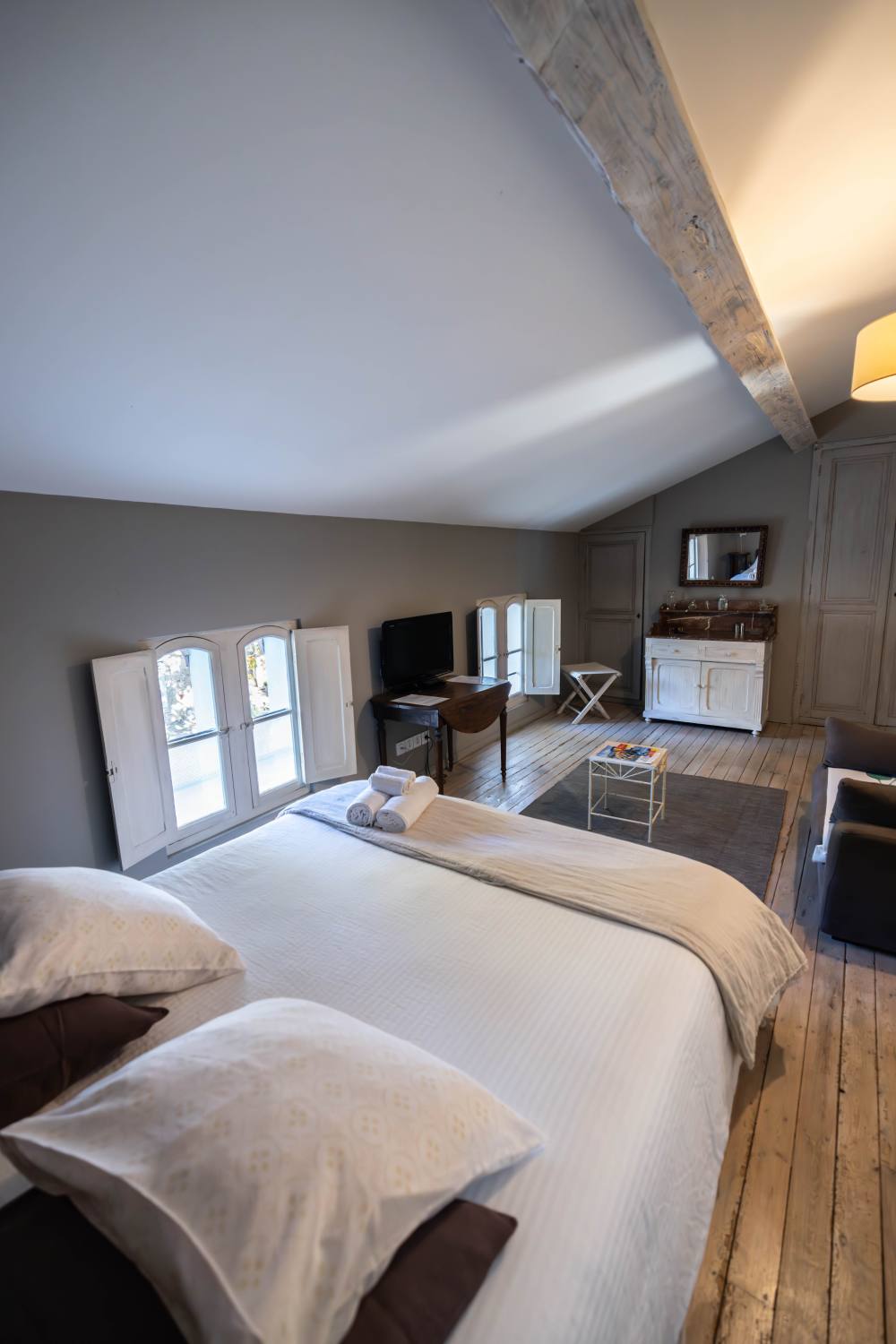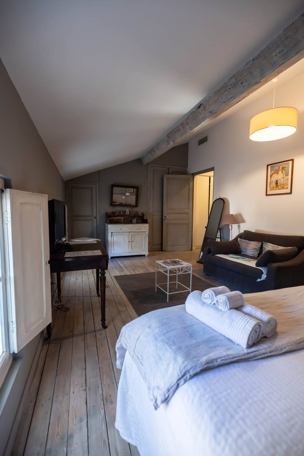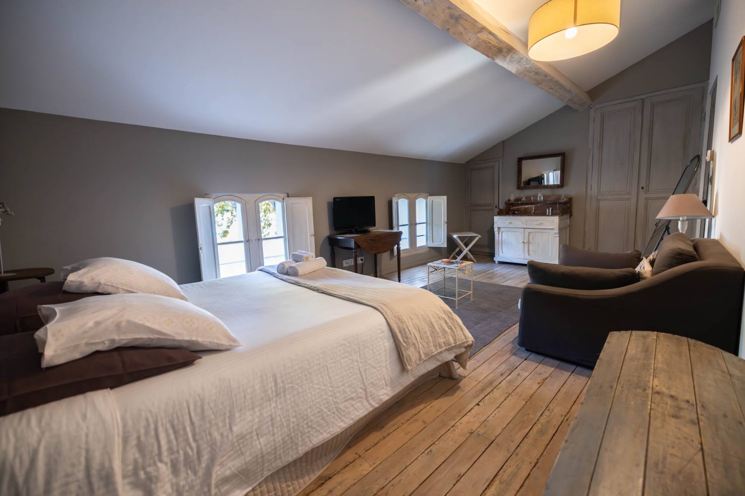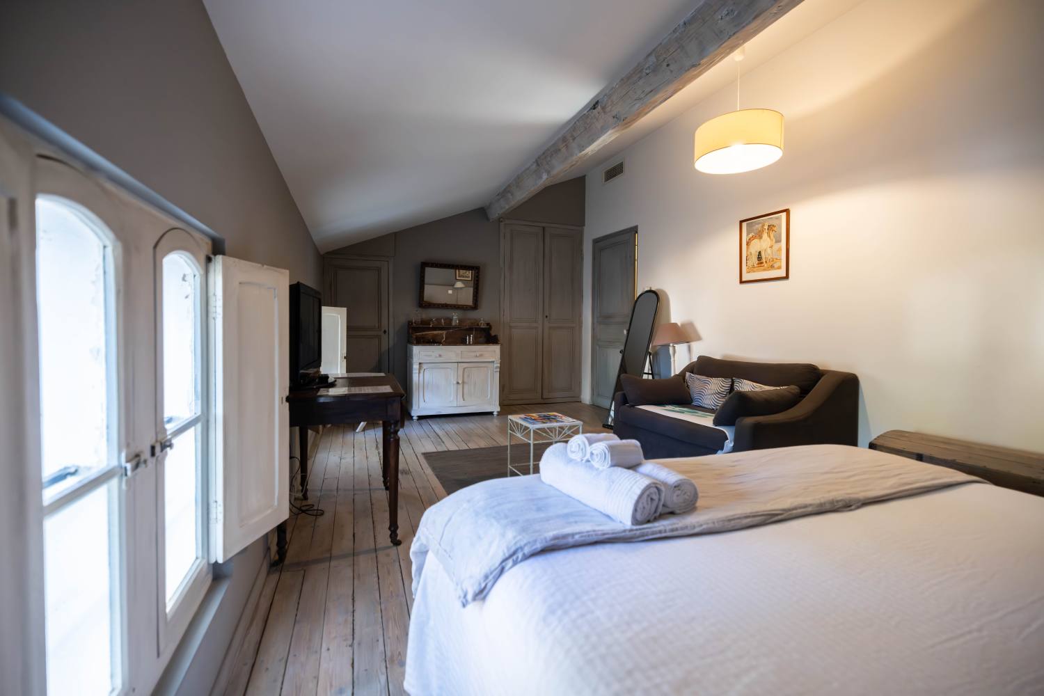 Vous serez séduits par le charme que dégage cette chambre : parquet en bois, colombages et fenêtres d’époque avec volets intérieurs.